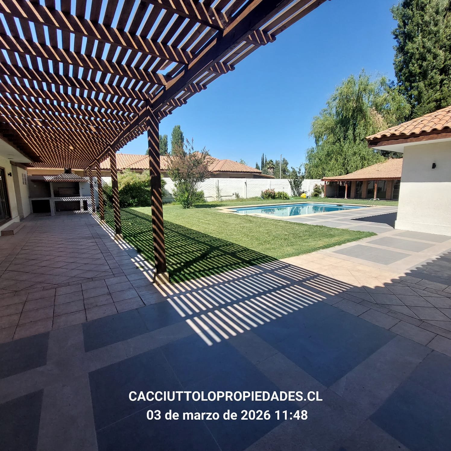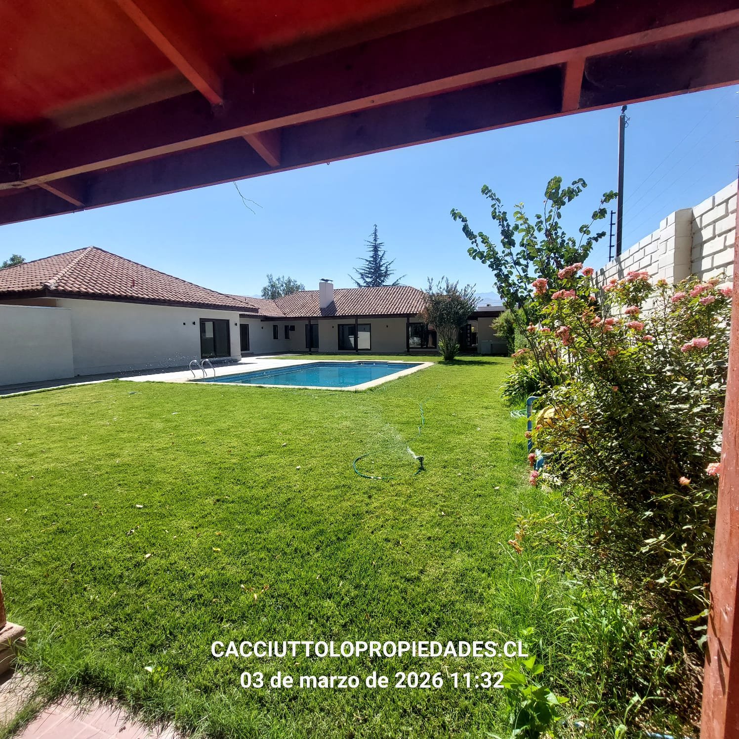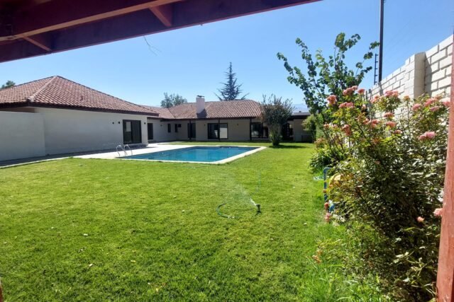 EXTERIOR: GRAN QUINCHO DE 135 M2 CON PISO DE PORCELANATO, EQUIPADO, VENTANALES TERMOPANEL, TERRAZA TECHADA, FOGÓN AL EXTERIOR DEL QUINCHO, AREAS VERDES, PISCINA DE 10 X 6 METROS, CAMARINES, ASADERA FAMILIAR, ANTEJARDÍN, PORTON AUTOMATICO, ESTACIONAMIENTO TECHADO PARA 4 VEHÍCULOS, SIN TECHAR PARA 8 VEHÍCULOS, PATIO INTERNO, DERECHOS DE AGUA DE RIEGO, SISTEMA DE RIEGO AUTOMÁTICO.